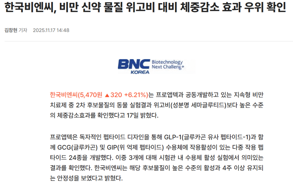 한국비엔씨와 프로앱텍이 동물실험을 진행한 결과, 노보노디스크의 위고비보다 20% 정도 체중감소 효과가 더 좋았다고 합니다!